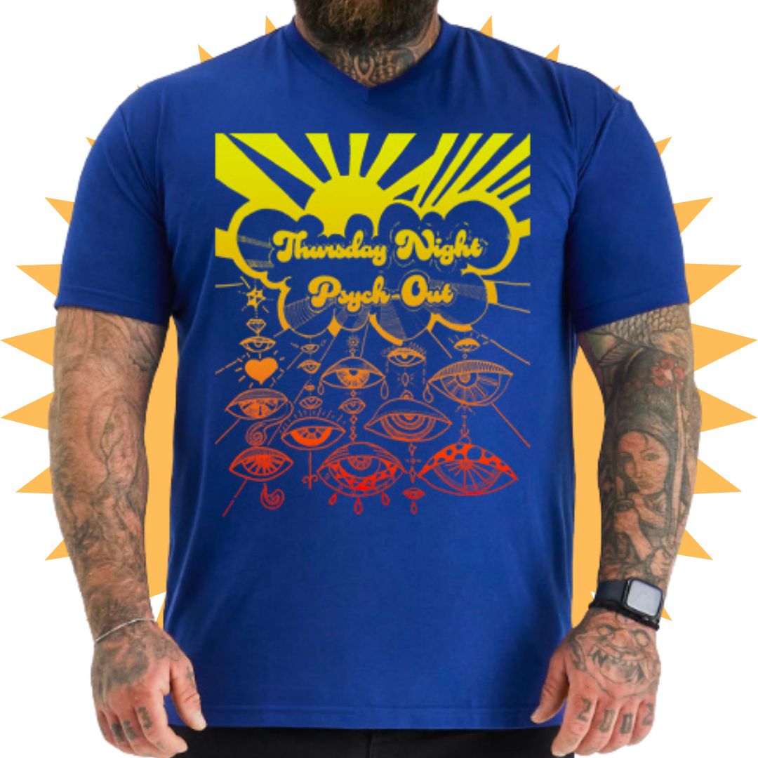 Each one of these screen printed shirts is as unique as the psych rock songs it represents. Printed on a blue shirt, the yellow to red ombre eyes were designed by DJ Mike himself.